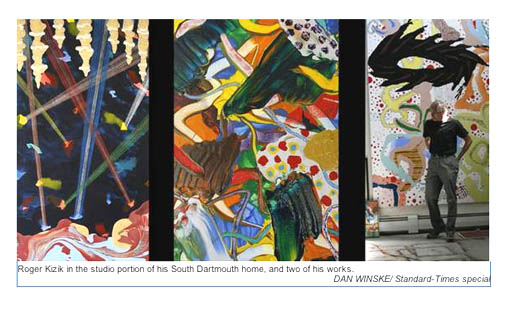 Friday June 1, 2007 Children are often big fans of Roger Kizik's colorful abstract paintings, and the Dartmouth artist says that's fine with him. Mr. Kizik, 61, grew up in Medford, where his father ran a sausage factory and played saxophone in a successful dance band. Mr. Kizik was introduced to art as a child during visits to his aunt, who lived on Fifth Avenue and took him to see New York City museums. He also accompanied his mother on Saturday afternoon trips to the DeCordova Museum in Lincoln, where he was most impressed with the abstract works. The teenage Roger drew and painted with dedication while in high school, then decided to join the Navy when he graduated in 1964. He spent his leave time visiting galleries and museums in Boston, Philadelphia and New York City. The abstract masters — Picasso, Matisse, Pollock and Rothko — inspired him with their power and audacity. ROGER KIZIK'S FAVORITE THINGS